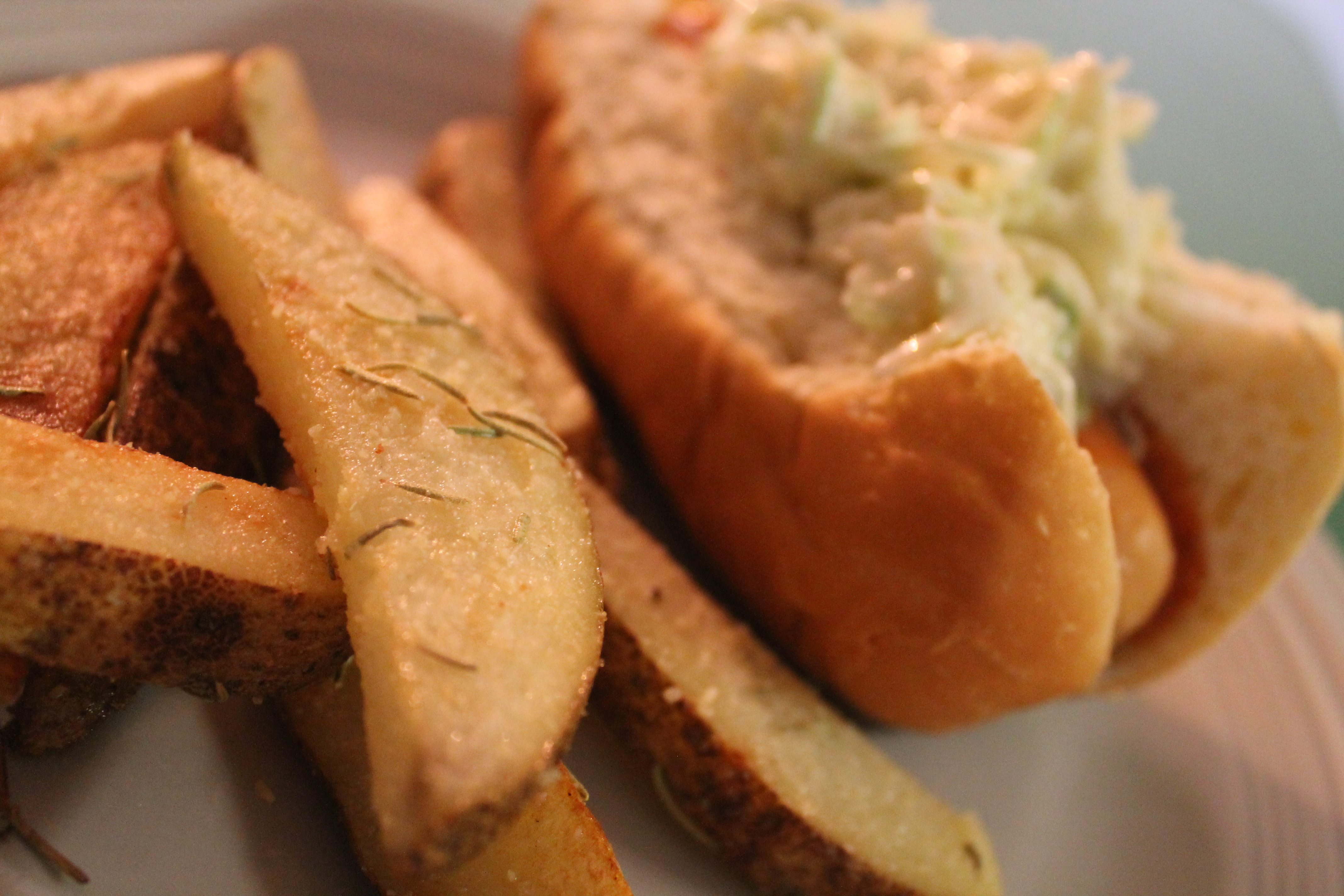 its summer time and what other perfect meal exemplifies this but hotdogs and french fries. i, over the years, have taken a fancy to smart dogs for my hotdog eating pleasure. this batch i slow cooked in some carolina mustard bbq sauce and then in true carolina fashion topped it with coleslaw. french fries of course for the side but not just any ordinary homemade french fries mine were tossed in fresh rosemary. i highly recommend dipping those fries in garlic mayo. oh summer i love thee!