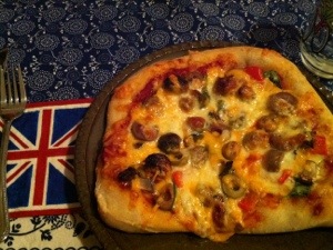 It was half cheese/half veggie Lentil loaf crumbles, sausage, roasted brussel sprouts, and tiny tomatoes.