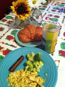 I’ve really been cutting back on the amount of meat I eat. It’s a personal choice for various reasons. For years (and sometimes still do) fix my veggie husband a different meal than my meaty one, but it’s so much nicer to share the same meal when you eat together. I do partake in a little chicken, turkey, and fish from time to time, but not very often. I very rarely even think about it anymore. When we visited mom and dad last weekend I had wonderful homemade meals of the poultry variety, but it was more meat than I’ve eaten in a month! So our returning home dinner was simple: Matzo Eggs, veggie sausage, broccoli, and a buttery croissant from Whole Foods Bakery.