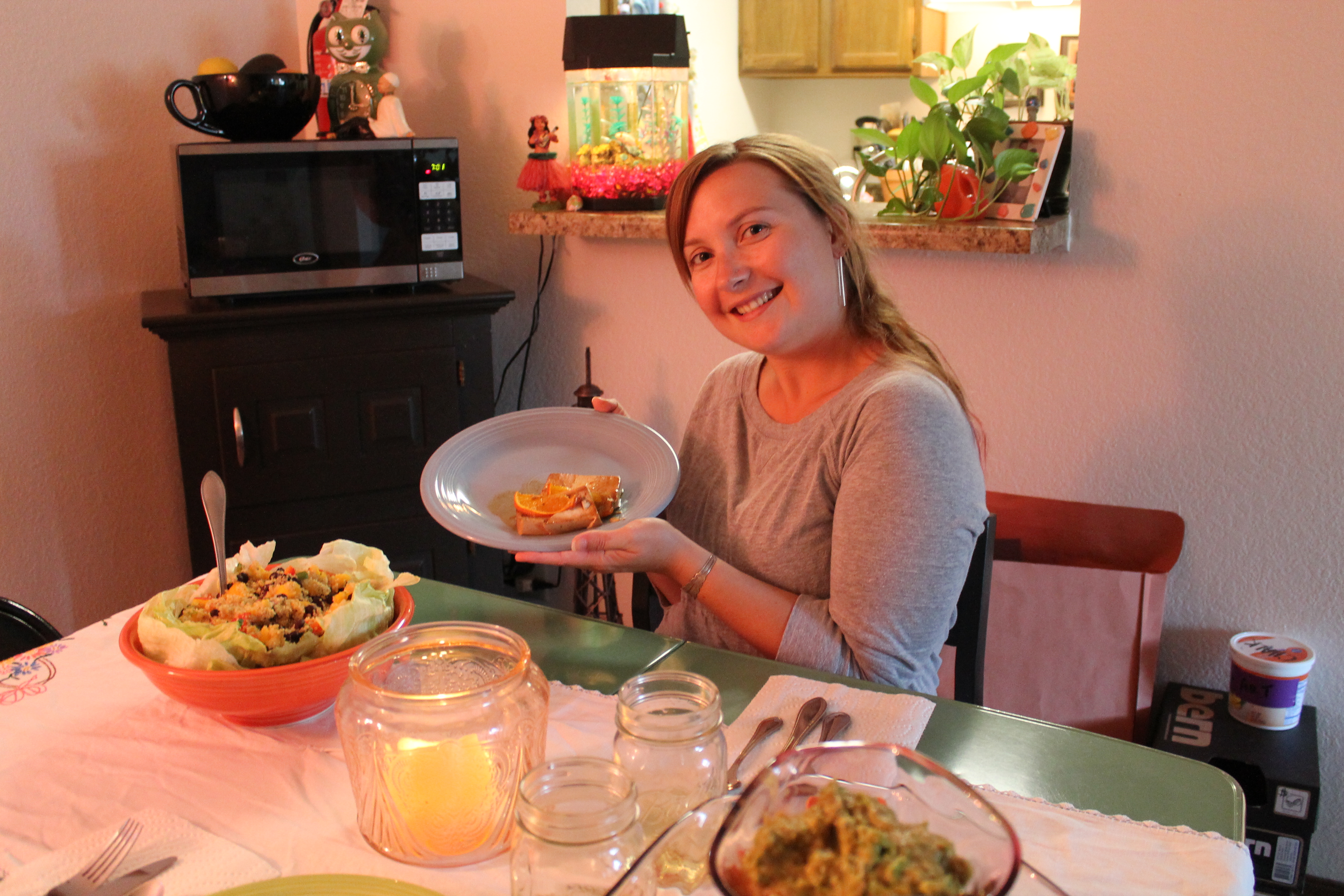 the menu: black bean and mango salad, tangerine baked tofu, guac and chips,