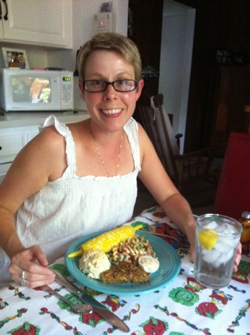 We had smokey tempeh (which I grilled in a cast iron skillet on the little charcoal grill), deviled eggs (I ran out of mustard and used Dijon instead– they were different, but just tasty) and garlic buttered corn on the cob. A last-minute addition was parmesan Jiffy biscuits!