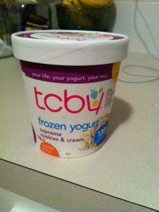 After cruising by Wal-Mart’s cookie aisle to pick-up the Oreo’s, I wheeled my cart of paper towels and TP over to the freezer section to pick up some vanilla ice cream. I was shocked to find pints and half gallons of TCBY yogurt waiting for me. Since I came to age during the 80’s and 90’s I do love myself some TCBY yogurt! It’s so hard to find TCBY frozen yogurt stores anymore (note the 80’s and 90’s reference).